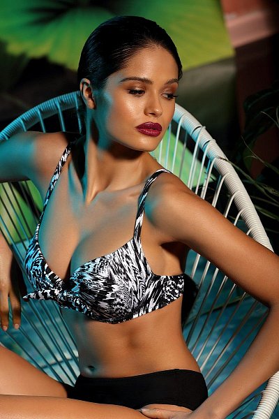 Раздельный купальник. Бюстгальтер с формованными эластичными чашками, со съемными пуш-ап вкладышами в чашках B, C, на косточках, выполнен с боковыми вертикальными пластинами для лучшей поддержки, бретельки регулируются по длине, на спине отстёгиваются, на спине застёжка. Трусики слип на стрейч-подкладке, со средней посадкой. В комплекте: лиф, плавки.