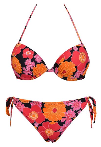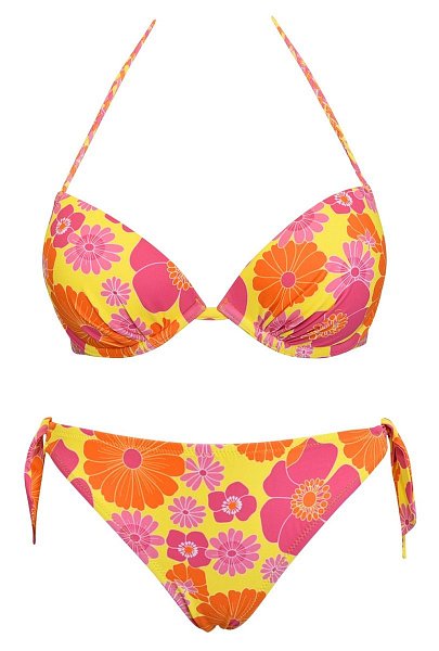 Раздельный купальник: бюстгальтер с формованной чашкой без пуш-ап на косточках. Нерегулируемые бретели с двойным вариантом завязывания. Застежка- завязка на спинке. Трусики-слип на завязках. В комплекте: лиф, плавки.