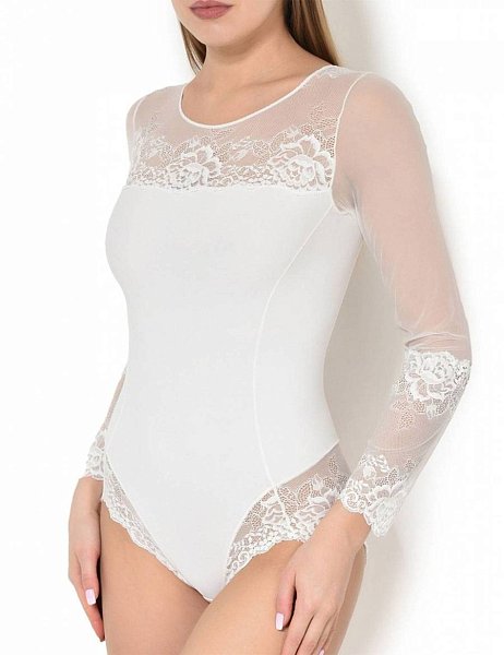 Боди из микрофибры и мягкого эластичного кружева с длинным рукавом, без чашек. Линия открытия ноги выполнена из кружева с бесшовным краем. Застежка на ластовице в три ряда на две позиции. Ластовица выполнена из уникального хлопкового материала.