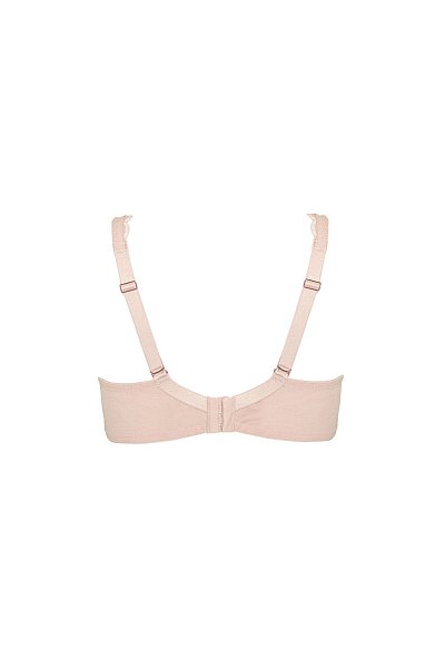 Бюстгальтер Chita M с мягкими чашечками на косточках, чашки шитые, покрыты кружевом, продублированы телесной тканью, с дополнительными боковыми поддержками. Бретельки регулируются по длине, отстёгиваются на спинке. На спине застёжка на удлинитель, количество крючков в ряду застёжки увеличивается пропорционально размеру бюстгальтера.