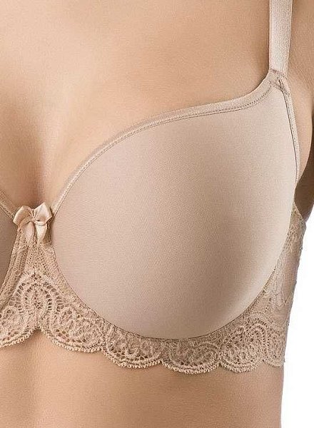 Бюстгальтер с формованными чашками на каркасах. Чашки бюстгальтера выполнены из специального дышащего не мнущегося материала. Боковая деталь стана - из кружевного полотна.