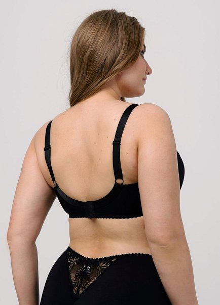 Бюстгальтер на каркасах с мягкой чашкой. Чашки овальной формы с диагональным членением создают округлую наполненную форму, эффектно приподымая грудь. Широкий стан плотно облегает тело, снимает нагрузку с плечевого пояса и обеспечивает стабильную комфортную посадку бюстгальтера на фигуре.