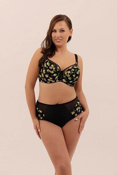 Бюстгальтер A-222 M выполнен на косточках, с боковыми поддержками для предотвращения скатывания пояса, чашки мягкие шитые из гипюра с принтом в виде лимончиков, с боковым подкроем, с Т-образным швом, продублированы черной стабилизирующей сеткой. Спинка из плотной стабилизирующей сетки. Бретельки не съемные, регулируются по длине, на спине застёжка - удлинитель на крючках, фурнитура металлическая крашеная.