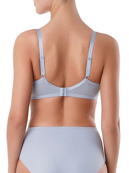 Бюстгальтер с мягкой чашкой с тройным диагональным членением, на каркасах. Чашка из неэластичного жаккардового полотна. Декоративная тесьма по линии декольте.