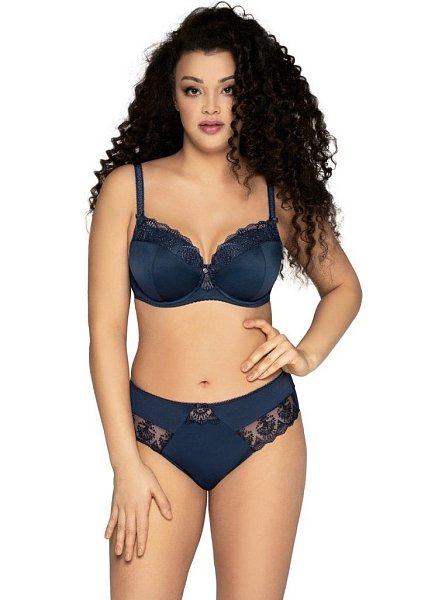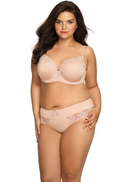 Бюстгальтер на косточках с боковыми поддержками, чашки шитые, на тонком поролоне, внутренняя сторона прошита хлопковым трикотажем, снаружи верхняя часть чашки декорирована сеткой с вышивкой. Бретельки регулируются по длине, на спине застёжка – удлинитель на крючках, фурнитура металлическая цвета меди.