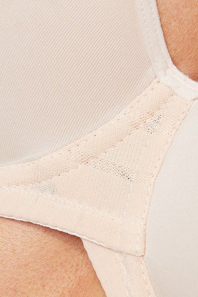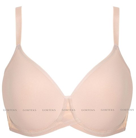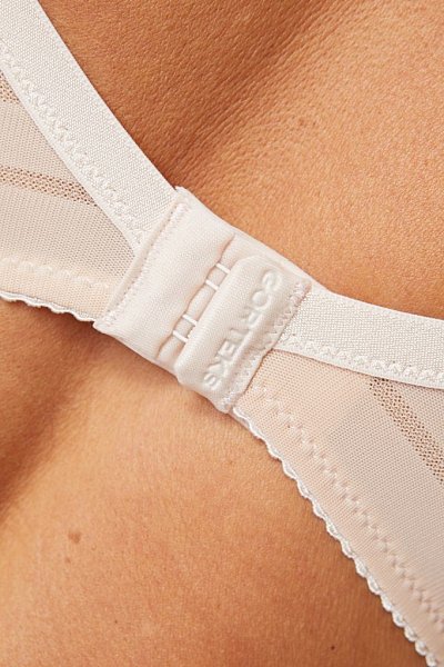 Бюстгальтер Luna с формованными поролоновыми чашками типа spacer на косточках, с дополнительными боковыми поддержками, внешняя сторона чашек гладкая. Спинка из сетки в полоску, продублирована стабилизирующей сеткой. Бретельки пришиты, регулируются по длине. На спине застёжка на удлинитель, количество крючков в ряду застёжки увеличивается пропорционально размеру бюстгальтера. Фурнитура металлическая крашеная.