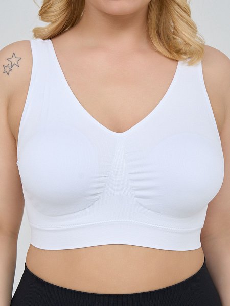 Гладкий бюстгальтер-топ, с подкроем для комфортного удержания груди, широкие бретели, формованные вставки вынимаются, очень комфортный, микрофибра, V-образный вырез делает фигуру зрительно стройнее.